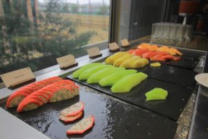 カレー、チーズ、寿司、フルーツ、サラダ、朝食バイキングにありそうなメニューは大体揃ってます。カレー美味しい。